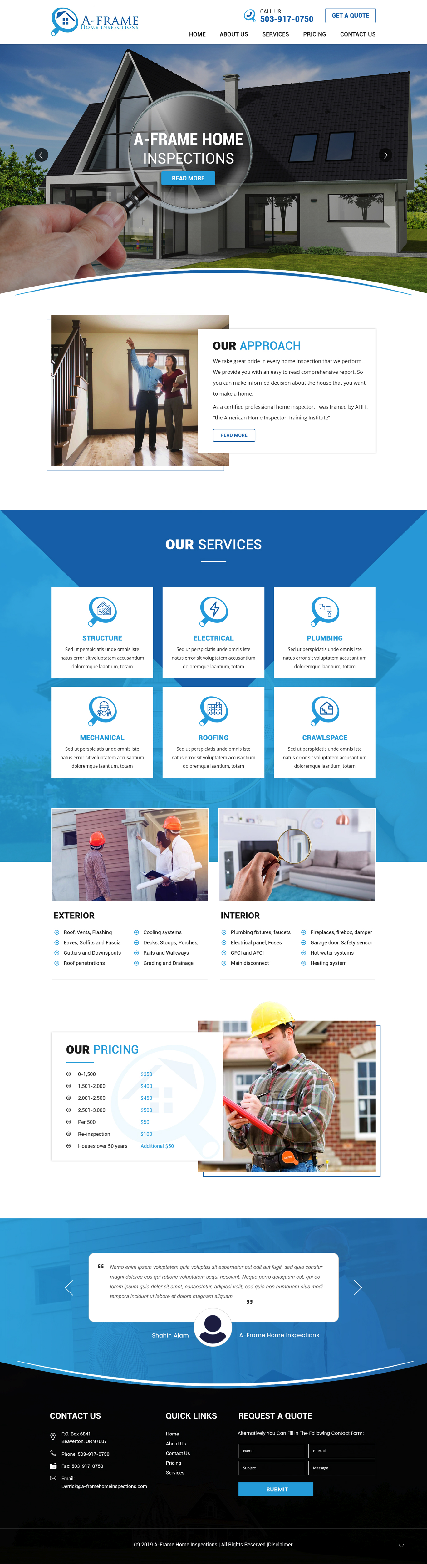 pb, a British designer, created this Professional Wordpress theme on 10th May, 2019 for A-Frame Home Inspection, a business in United States. The Wordpress theme was designed for the project 'A-Frame Home Inspections needs a WordPress Design and the coded website.'.