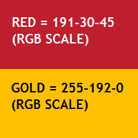 - Theme colors are red (RGB scale 191-30-45) and gold (RGB scale 255-192-0), on a white background.