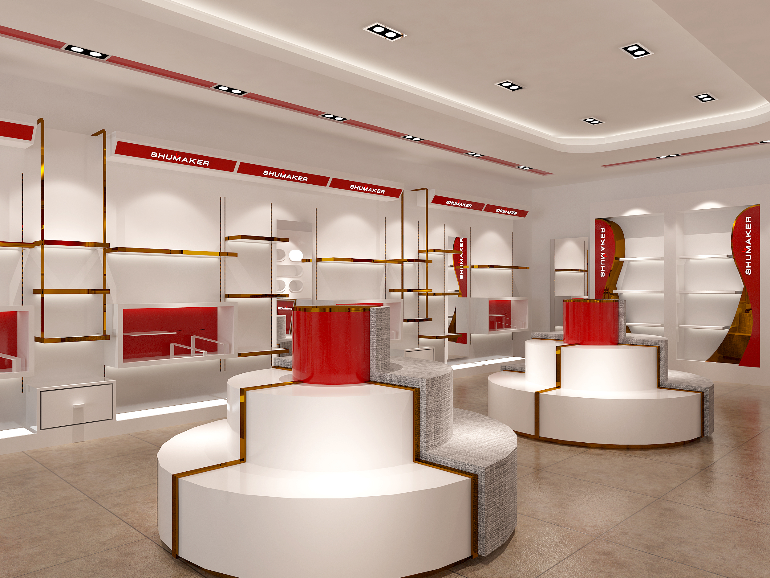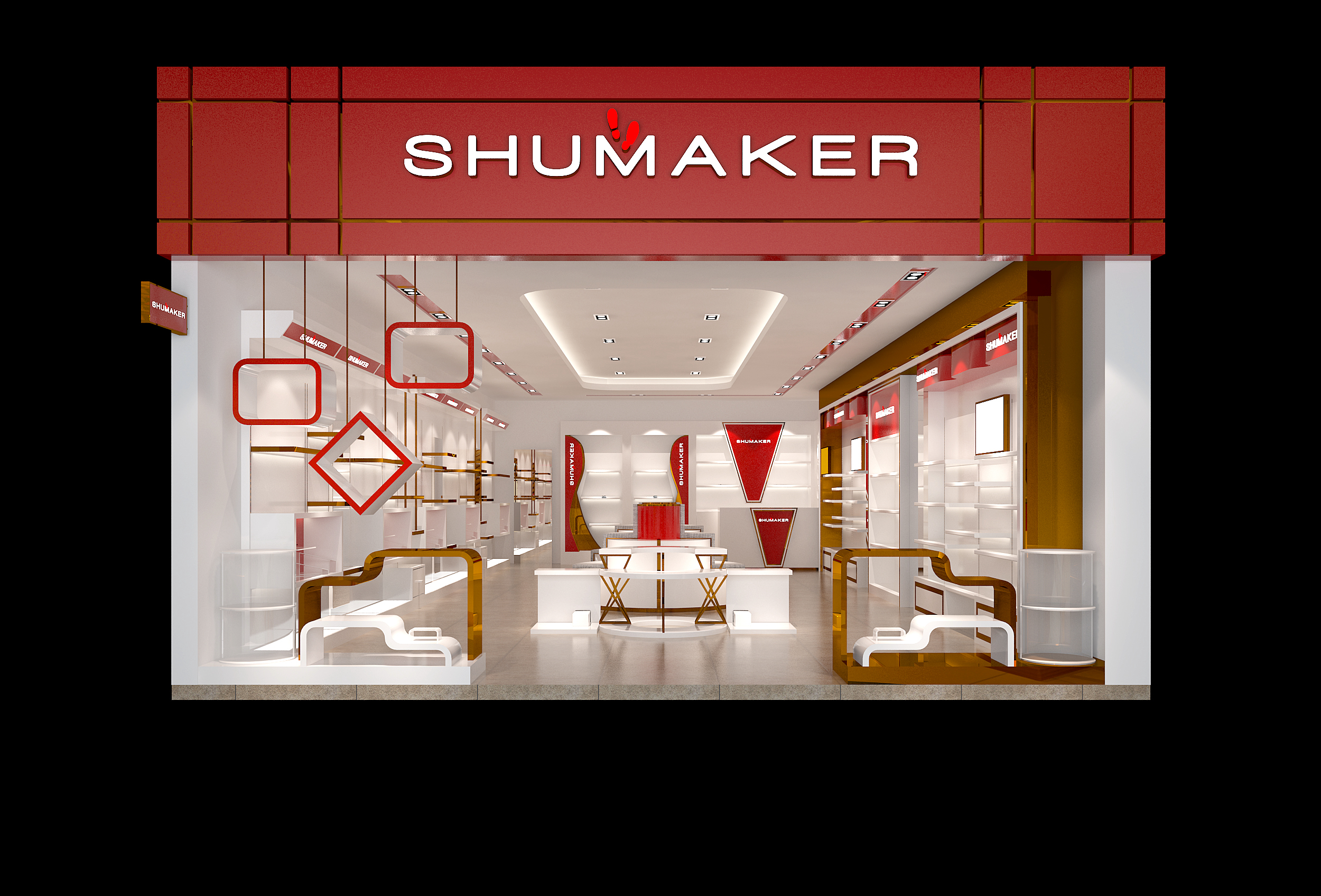 Attached are the SHUMAKER store pictures, as well as the logo / pantone color document. The primary colors identifying SHUMAKER are Rose gold, white, and red.