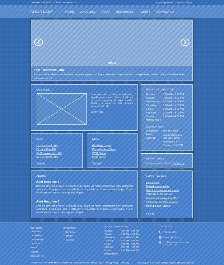 This is a multiuser WordPress subscription site for medical clinics. Please see attachment for sitemap. Please do not include extra content like social media icons, search bars, or images. If you have questions, please ask for clarification.