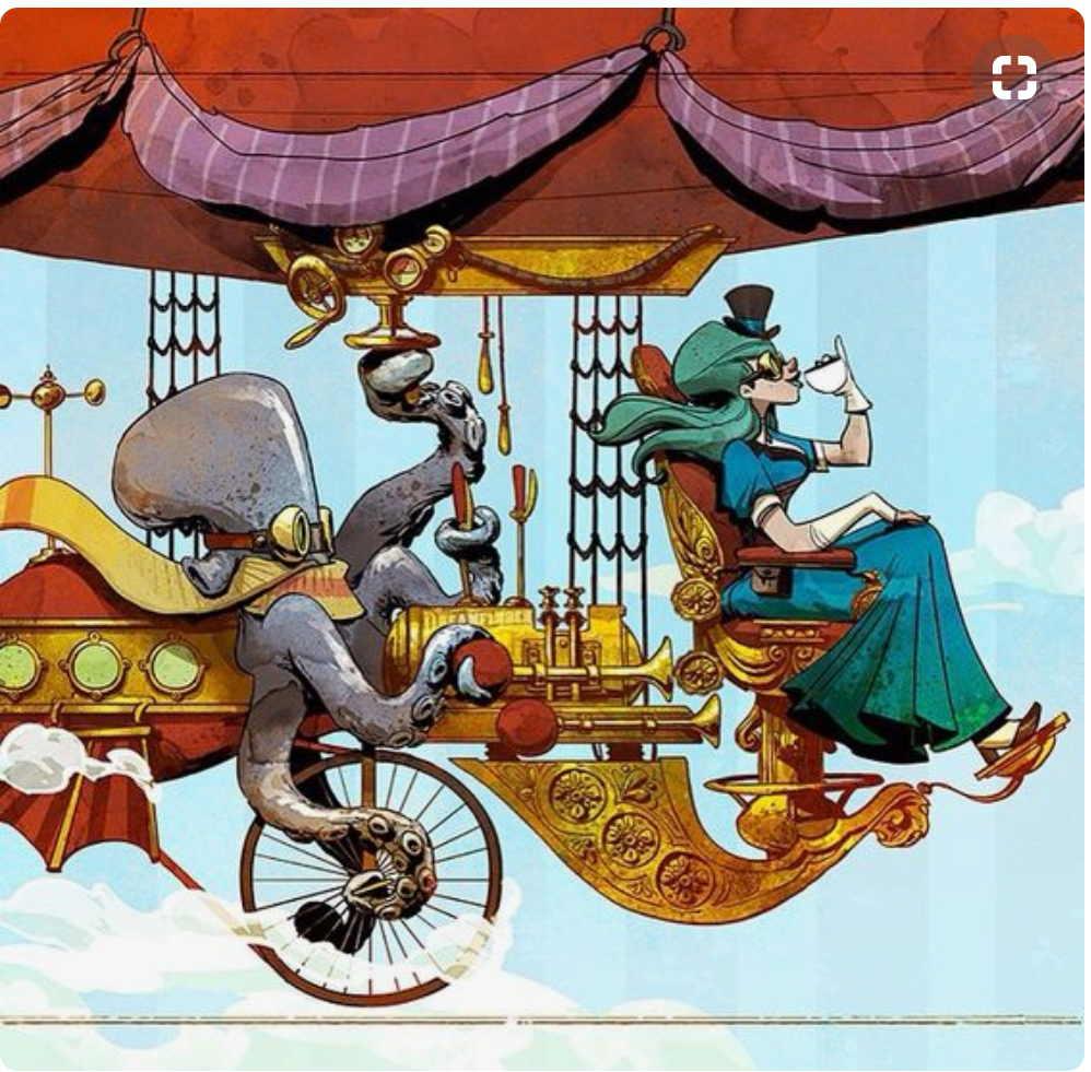 'Saucy' octopus/Cuttlefish figure,dressed in 19th century style with a steampunk aesthetic. Think lady octopus/cuttlefish adventurer with sabre or pistol. Octopus/cuttlefish with long tentacles holding aloft the "Tyalgum' boat as if playing with it.