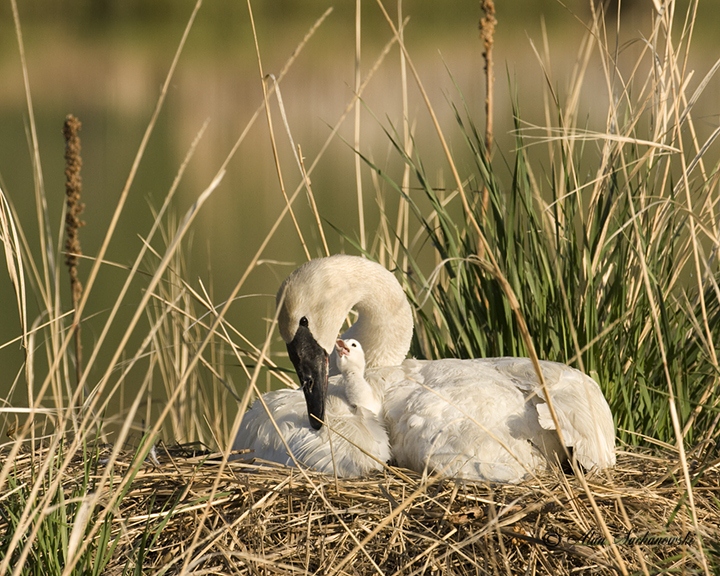 - image of a nesting Trumpeter Swan that conveys enough bill detail that a person can tell it is a trumpeter and not some other species.