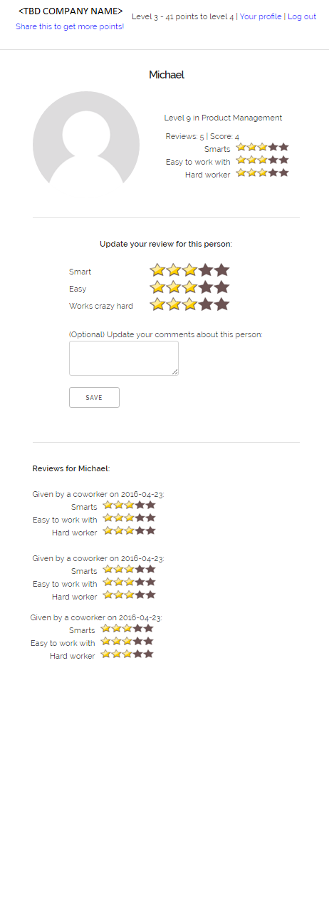 - c) profile page: This is where you view a specific person. You see the person's picture, some info about the person, you see their overall rating, you can rate them, and you also see their historical ratings.