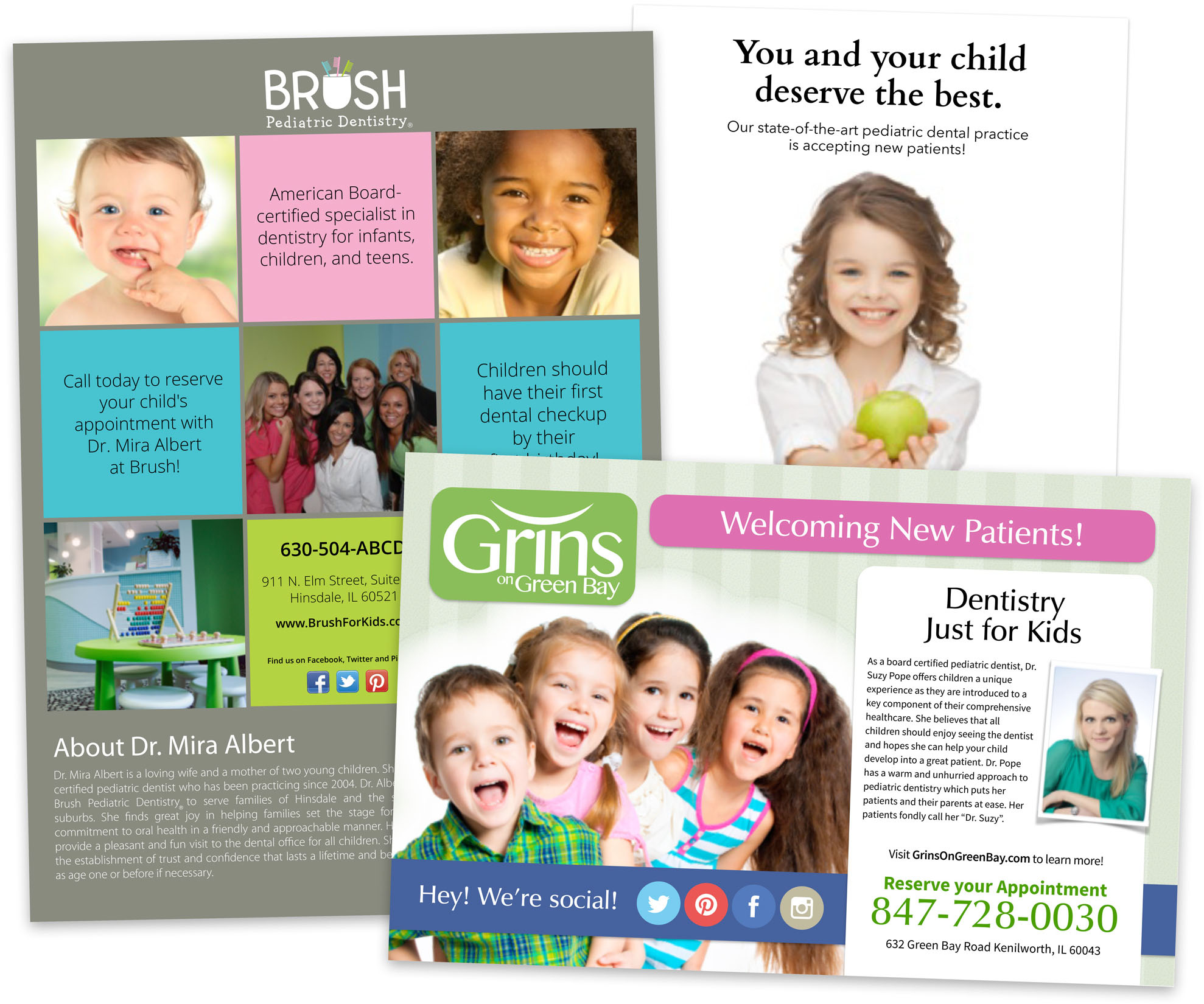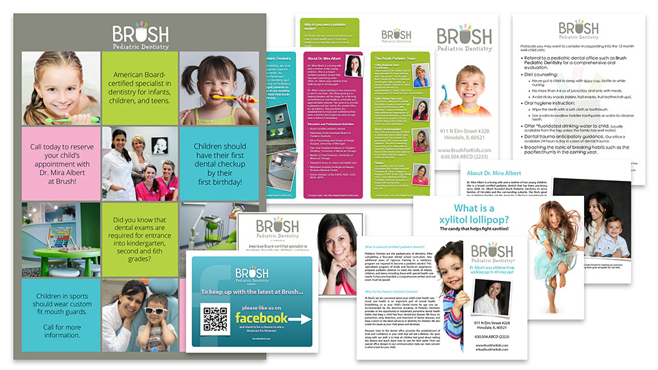 - We must have our office information (ie: Logo, telephone number, address). we would love to have children smiling on the cards. We would love to have something look like the "Brush" pediatric dental.