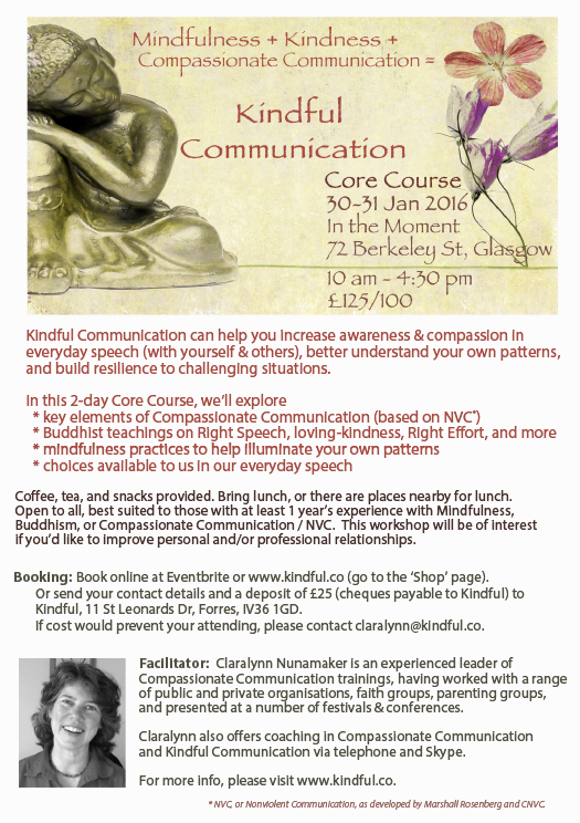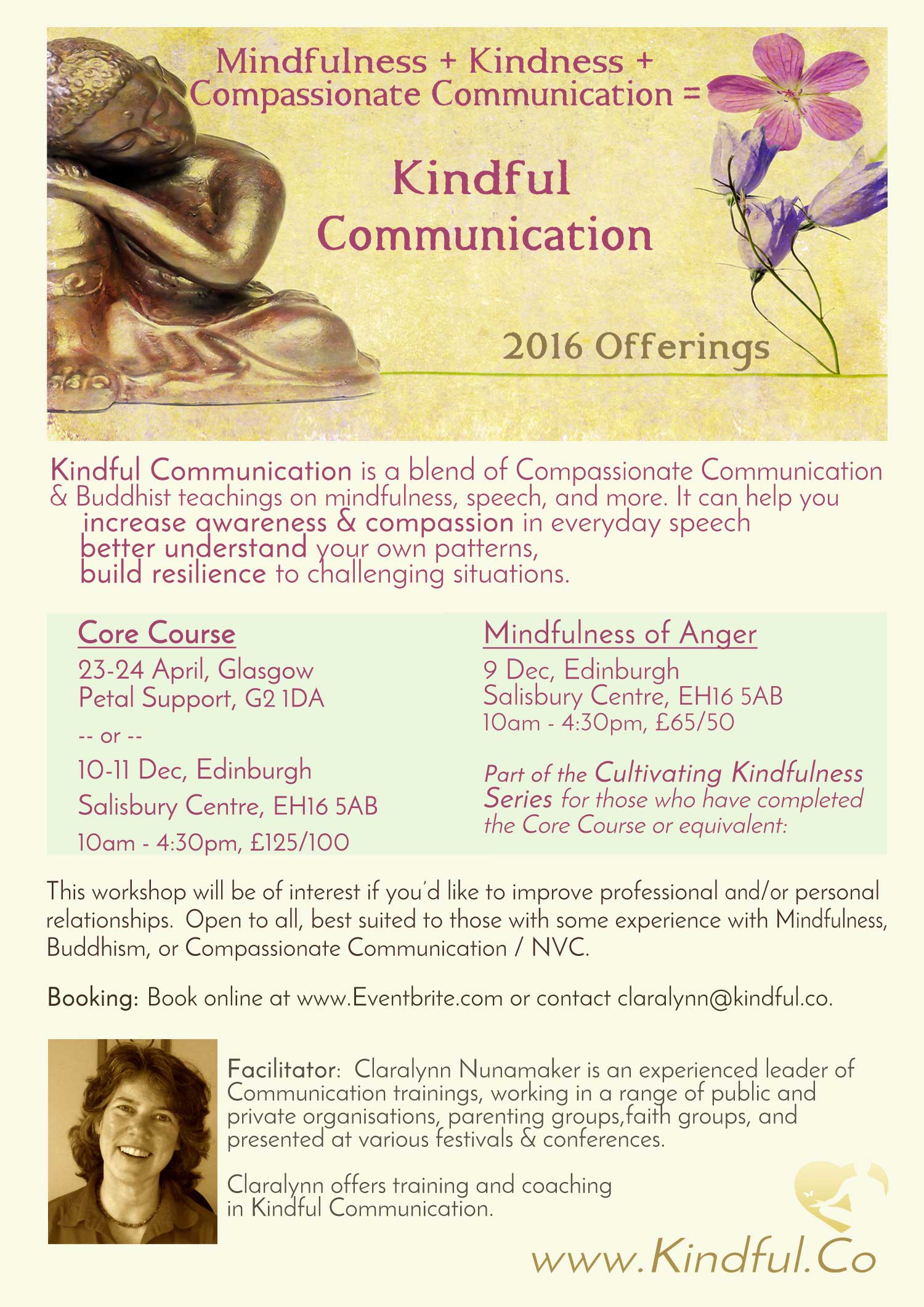 I need a A5-size, single-sided flyer design for my training days. They are weekends in a blend of Compassionate Communication and Buddhist teachings called Kindful Communication. The logo for Kindful that should be included.