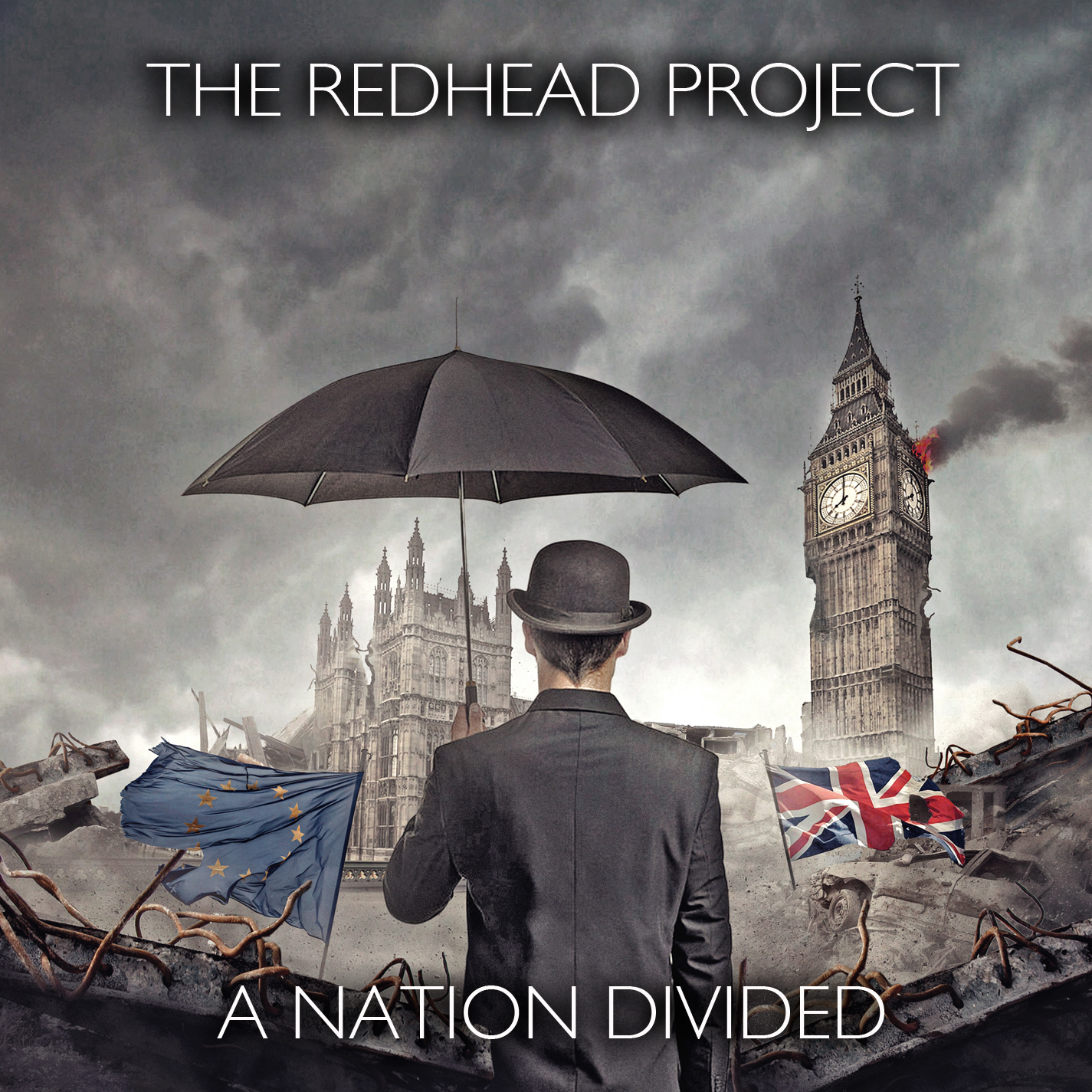 A faceless man and 'The Ringmistress', are standing in the middle of a field, facing forward. The field is a field of roses, but they are all dead apart from one, which is still alive, and is a multicoloured rose. The Ringmistress is standing behind the man, her head over his right shoulder, arms around his chest, ripping open his shirt to reveal his heart on fire. The sky in the background is tinted red, full with a thunderstorm/lightning.