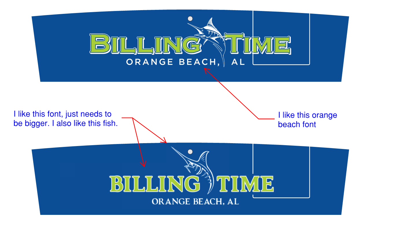 I need a logo for our fishing team/boat. This is a deep sea bill fishing team that fishes for marlin and yellow fin tunas. We want to use royal blue (or similar) and lime green as our colors. See attached word document for what the back of our boat will look like. I also uploaded some sample logos from other billfishing teams. Also, see a pictures of our boat.