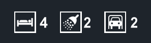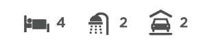 5. Under this heading needs to be 3 icons ( icon for number of bedrooms, icon for number of bathrooms and icon for number of cars that fit it the carport/garage.) Next to each icon will be a number which i will need to be able to edit. I have attached 4 examples.