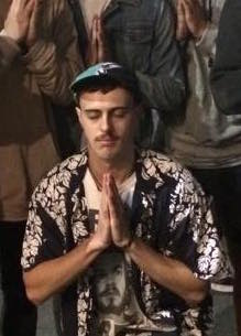 A simple clean sketch that can be printed onto t shirts and other clothing in any colour. Must be simple lines with no background. It is a sketch of a person in a prayer pose. I only want him from the waist up. The logo must look like the actual person we are depicting. Please use the floral shirt he is wearing as well as the hat (it's a flat brim baseball hat). But keep the lines all very clean and simple. No colour at all. Include his moustache. The logo will also feature the words "Yeh Goodboy Energies" either below it or around it.