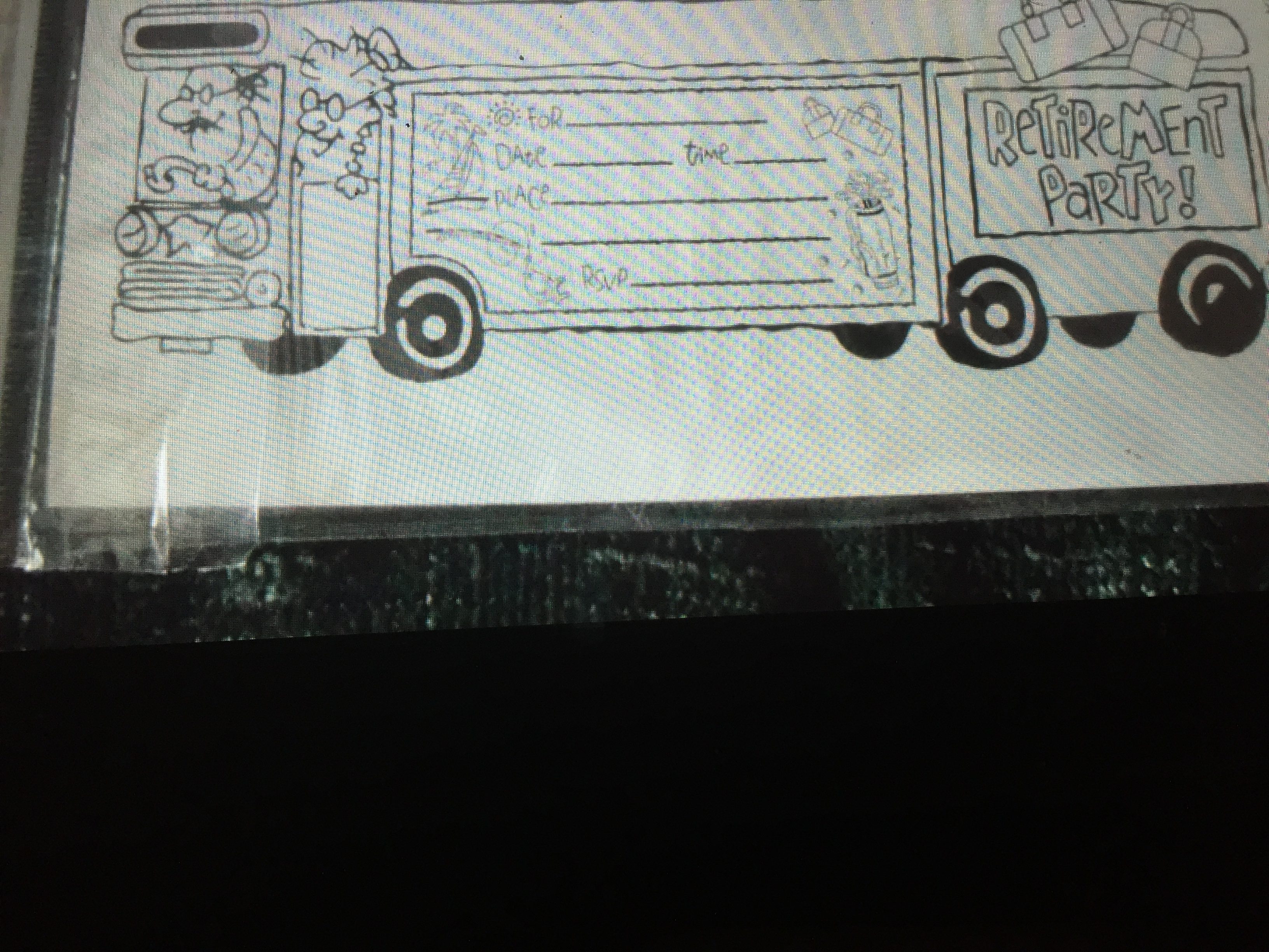 To create the front page for an A5 invitation (back page wording optional, but expected for top designers), using a cartoon inspired motorhome as the main front page image.