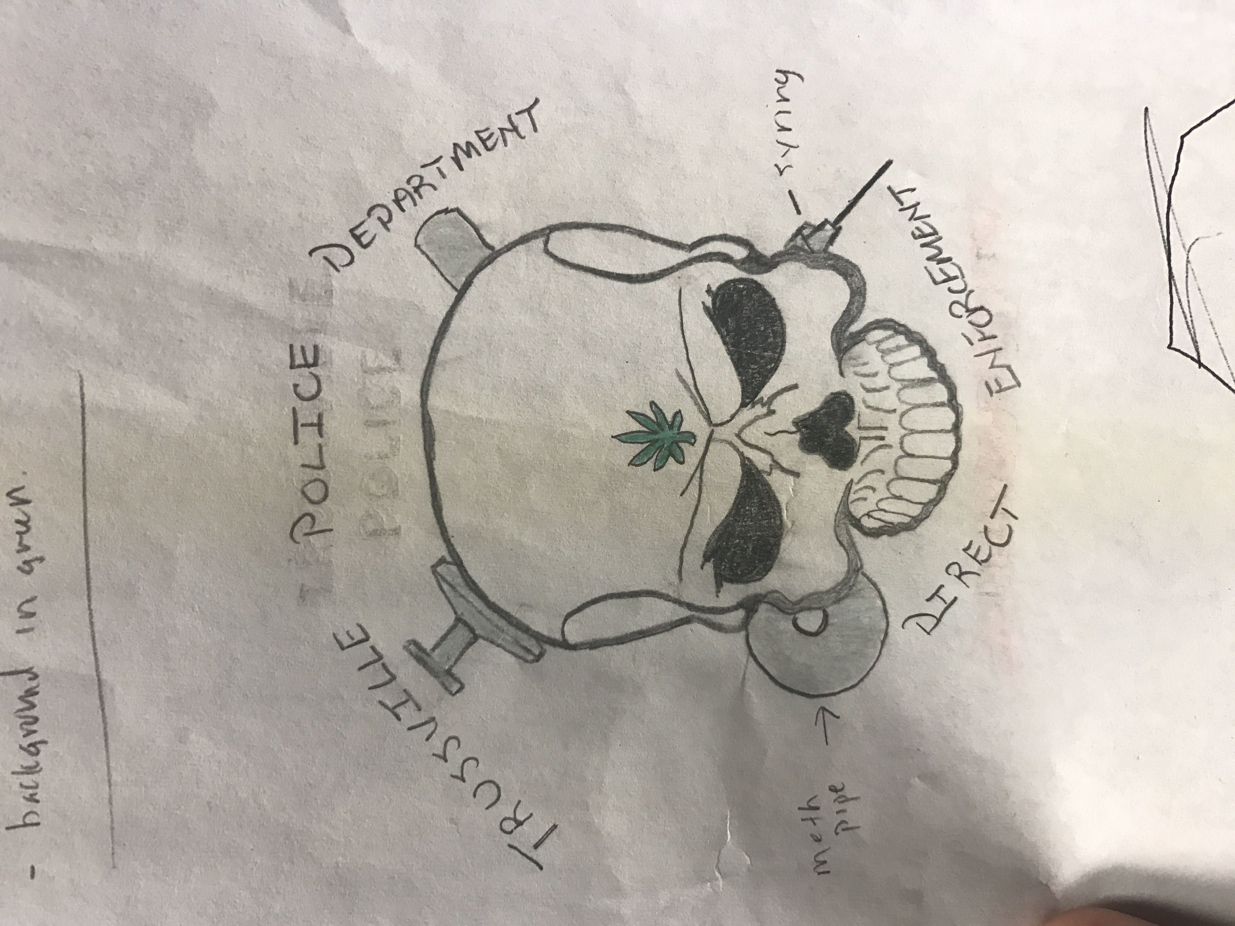 - Similar in nature to the attached photo. Please note that it is a meth pipe and needle behind the skull and those words should be removed from the design. Skull being the center piece. Must say Trussville Police Direct Enforcement.