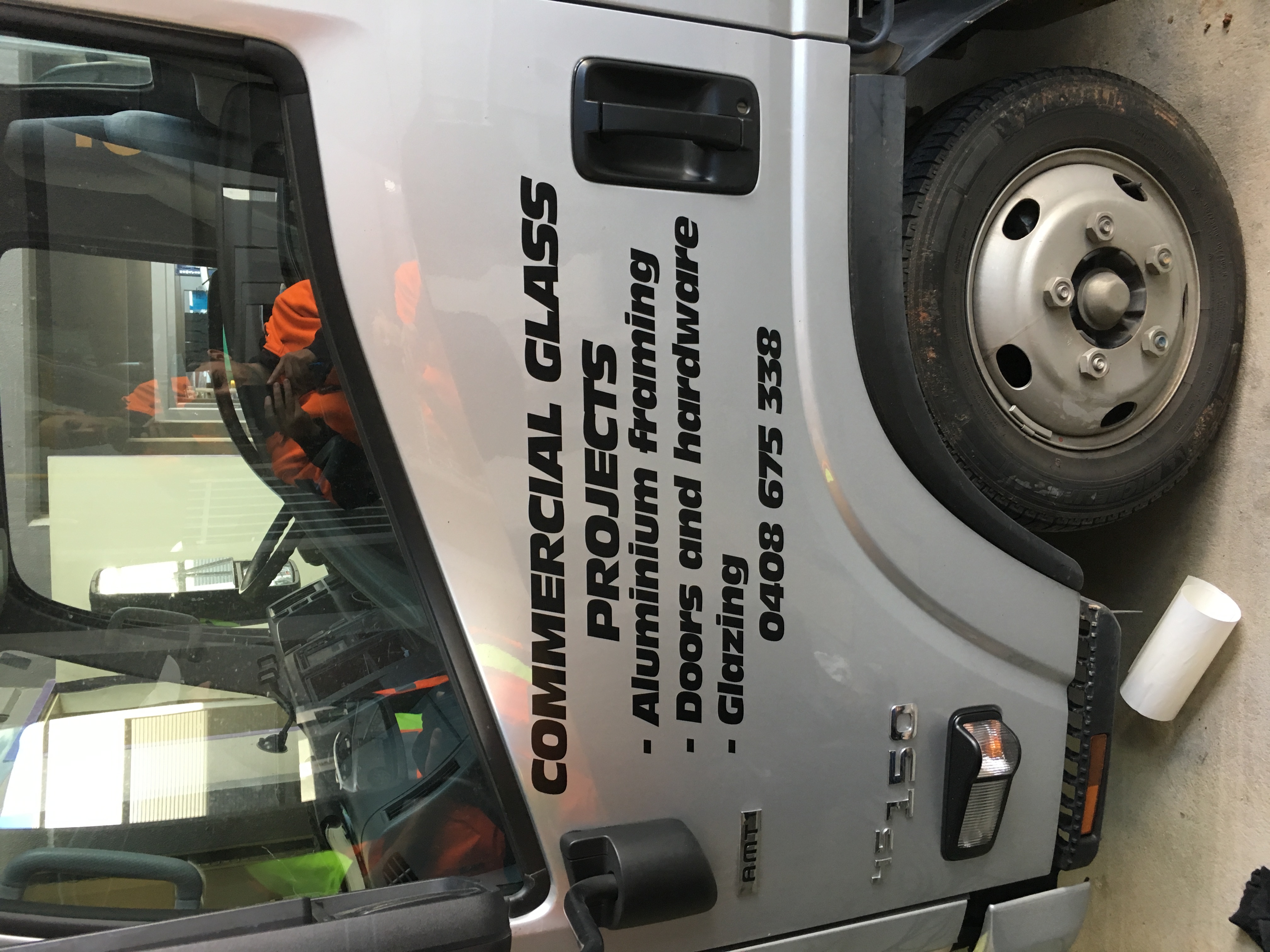 New signage. Would prefer to have CGP in a larger font and commercial glass projects smaller or underneath it. Our main colours would be black charcoal and anodised silver. We do glass and aluminium framing so if it can represent that some how that would be great but just want something simple. And with the colours for signage on cars if you can find a colour that makes it pop we are happy to try out something to make it stand out. Photos attached are just photoshopped on and was a simple idea but too basic