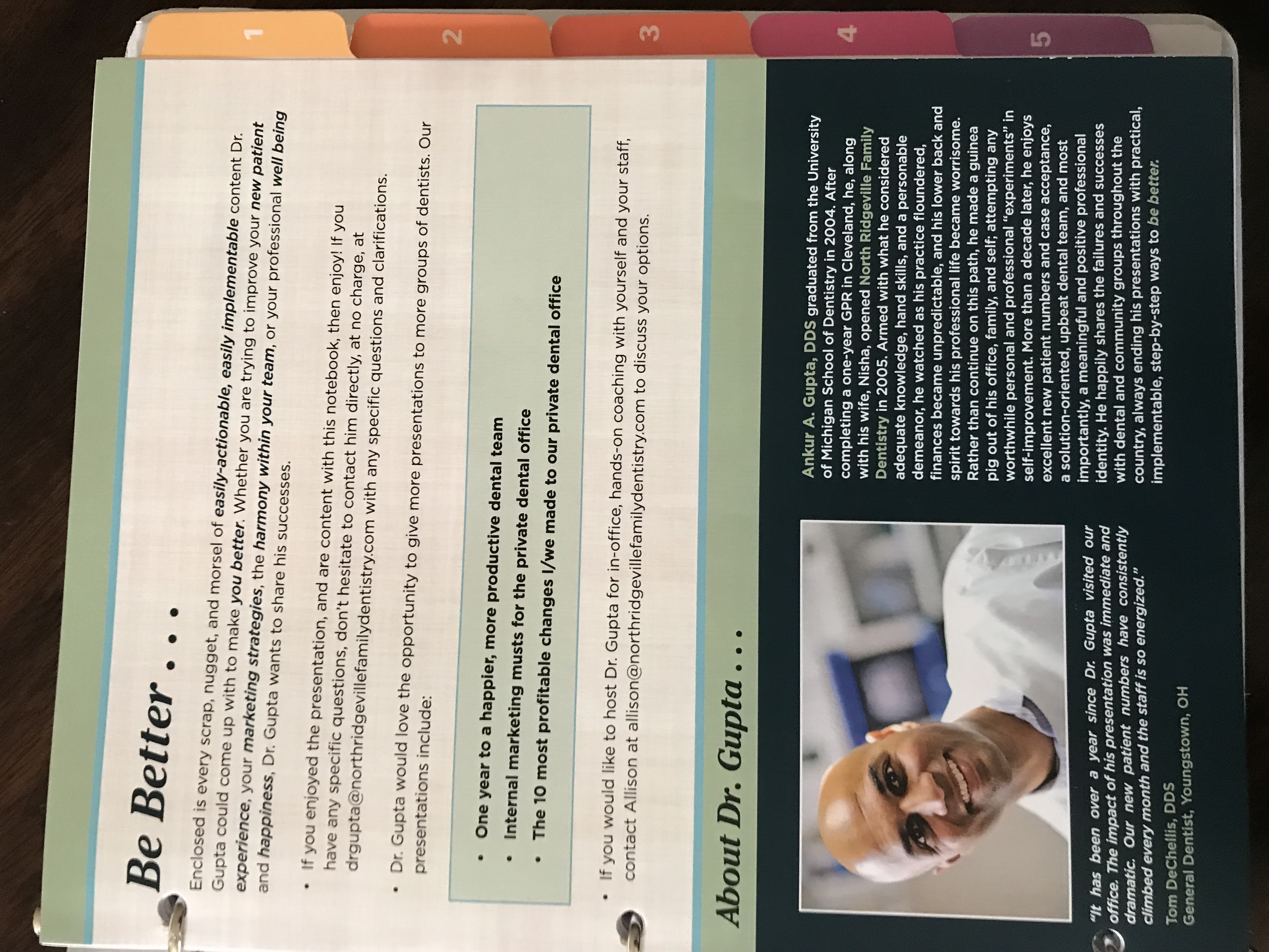 Hello - I currently am the speaker for various motivational seminars throughout the US. My presentations are primarily for Dentists and their staff about health and longevity. Recently, I have been asked by non-dental groups to speak about the same stuff. All of my material and website currently have my dental practice logo (www.northridgevillefamilydentistry), but what I really need is an independent brand specifically for my BeBetter Seminars. I have attached an info sheet that I currently use. It would be nice if the logo matches some of the same colors.