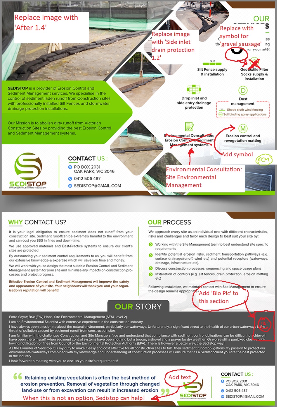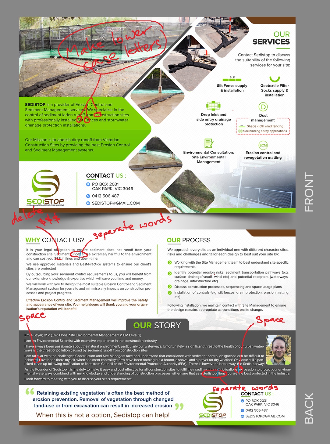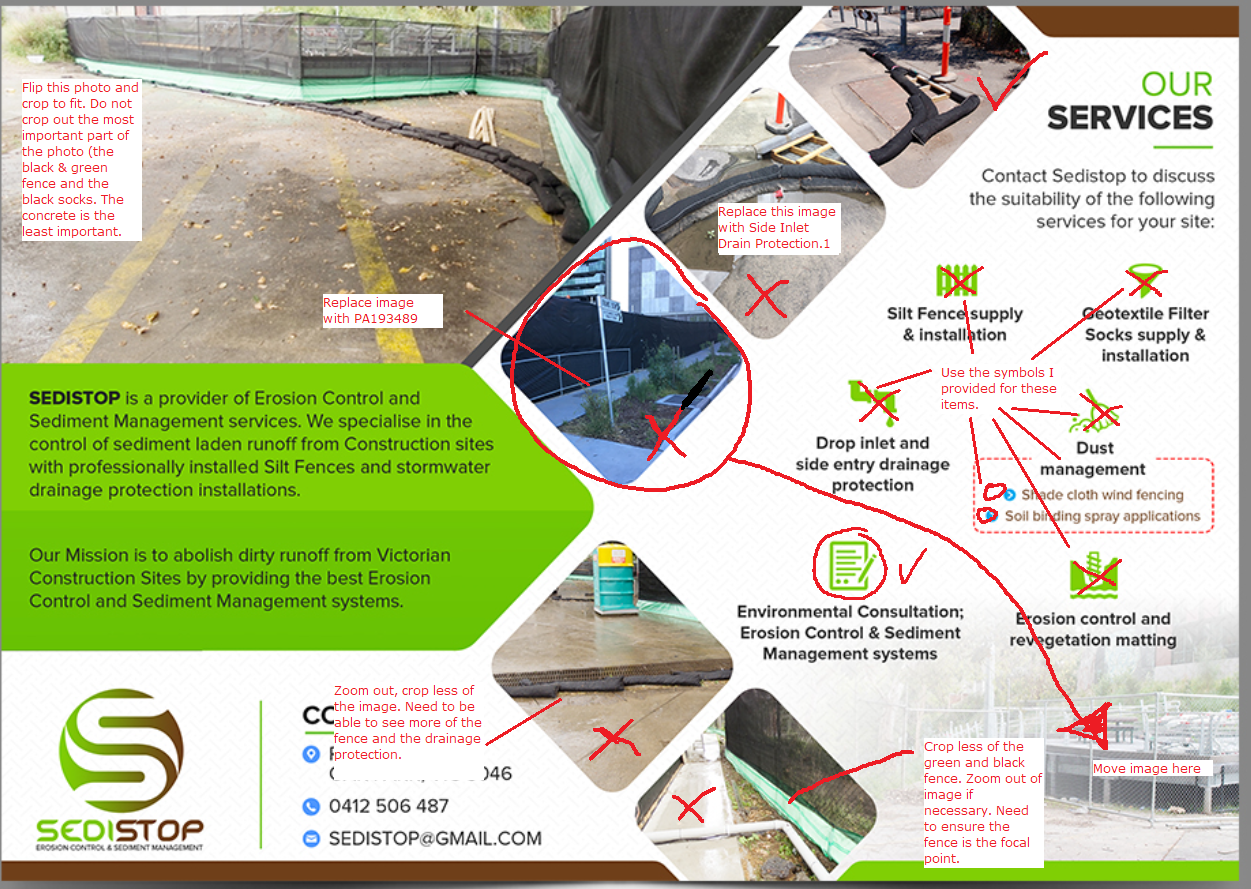 Sedistop is a new business which provides Erosion Control & Sediment Management services to the Civil and Construction industry. We need a brochure which will be personally handed to Construction Site Managers. Brochure is to describe the types of service provided, benefit to clients and the environment.