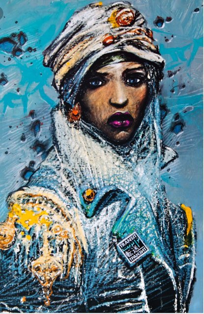 The character is a futurist, humanoid, purple-and curly-haired woman. She would be partly human and partly a cyborg. The left side of her body would have been severely wounded and more repaired than healed, using natural, as well as artificial elements, materials, or objects (e.g.: branches, leaves, sea shells, metals, music instruments…). She has a bass clef engraved in the middle of the metal left part of her back. Her left leg is made of mixed up tree roots that help her connect to the Earth. For greater convenience, we call her ‘Lady Zaarba,’ in further descriptions, below.