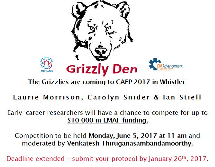 The Grizzly Den is a highly-entertaining and educational event where you can learn about how top-notch reviewers evaluate proposals. By a consensus of the Grizzlies, the best protocol will be announced at the CAEP Research Awards Ceremony.
