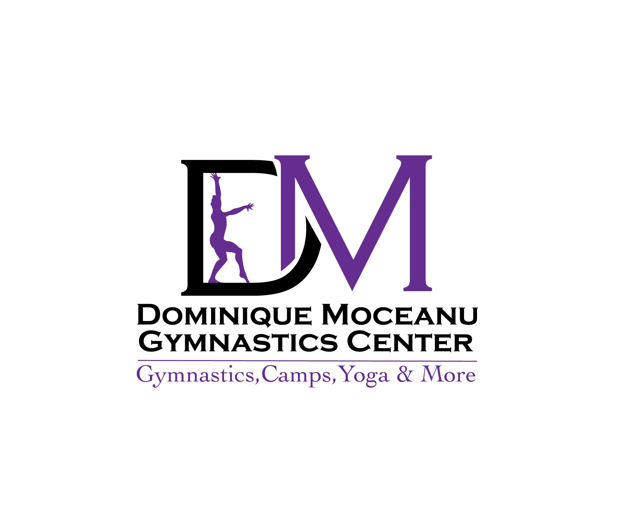 Develop a business card with my DM logo provided. A classy and unique design using the colors black, white, purple and maybe a splash of gold. Add Address (734 N. Progress Drive Medina, Ohio 44256), email (DominiqueMoceanuGymnasticsCtr@gmail.com, website (www.DominiqueMoceanuGymnasticsCenter.com), phone number (216-970-1357) on the card. Social media if there's room also. t: @MoceanuGym, i: @MoceanuGym, f: @DominiqueMoceanuGymnasticsCenter
