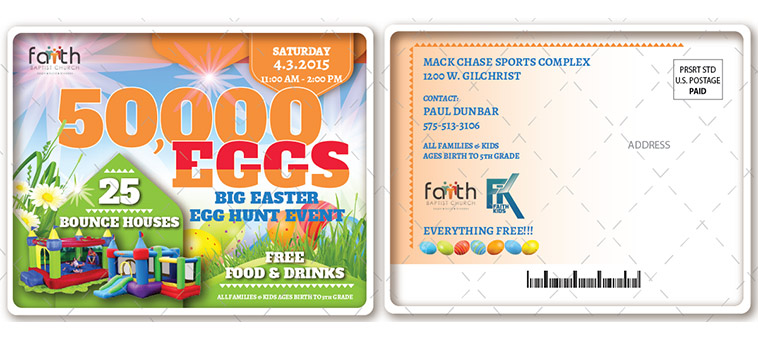 We need a postcard about 4 X 5 inches two sided to advertise our Easter Egg drop.