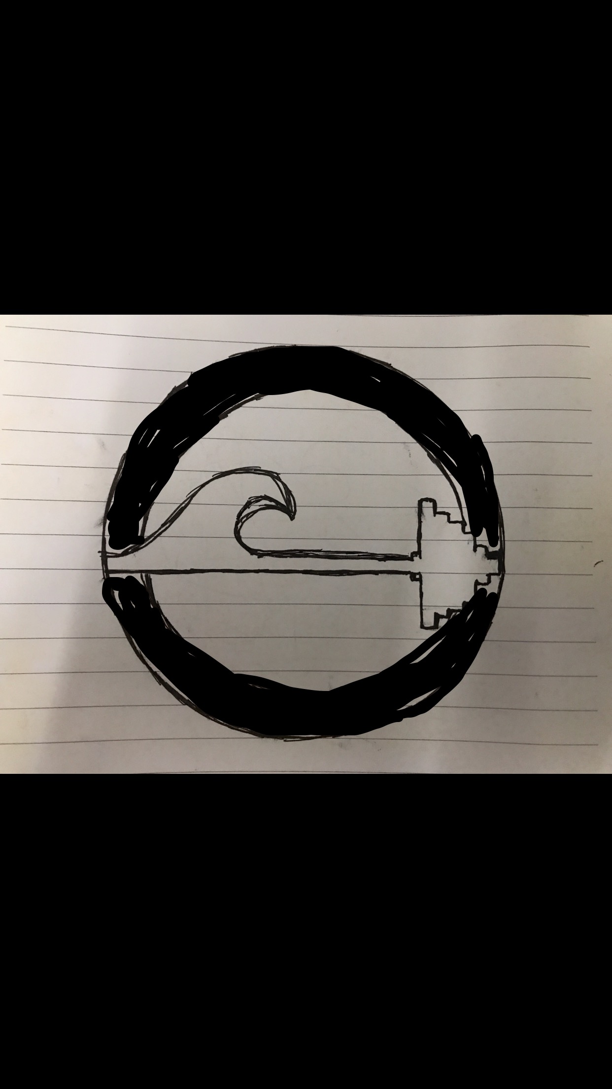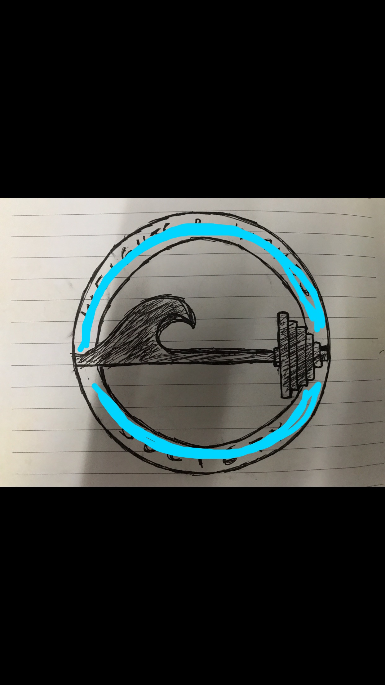 - Please do not try to make your own version of the wave/barbell. I want someone to draw an outline using their designing skills that looks exactly like the one I drew in my sketch (view the sketched photo with the blue line circling around the design). The only thing I would be willing to manipulate is adding in more detail to the wave and the barbell plates.