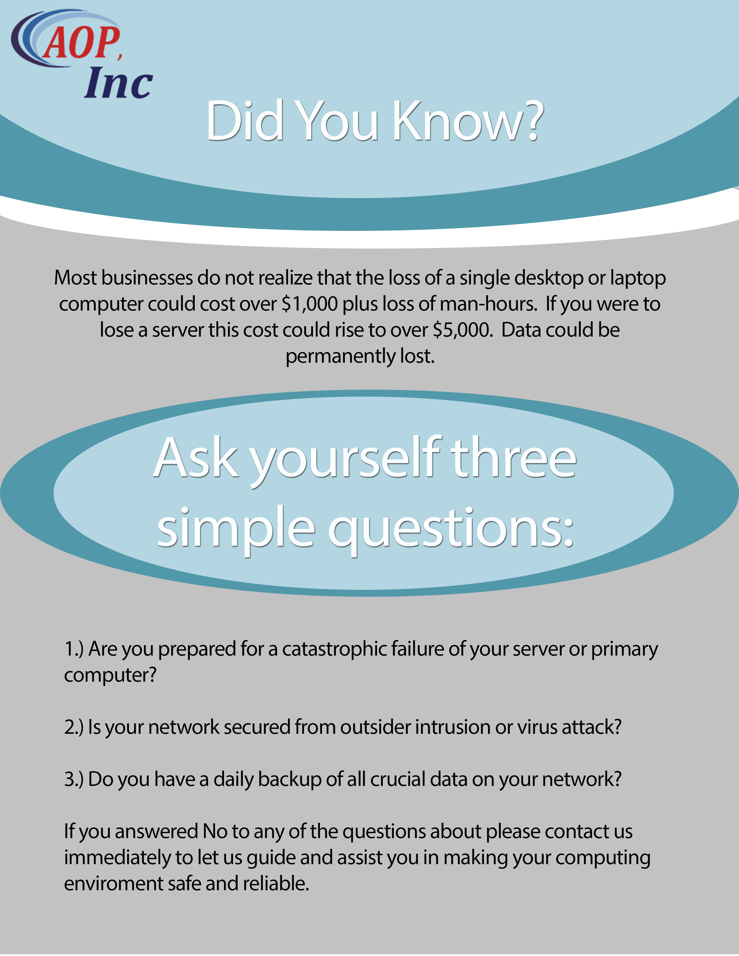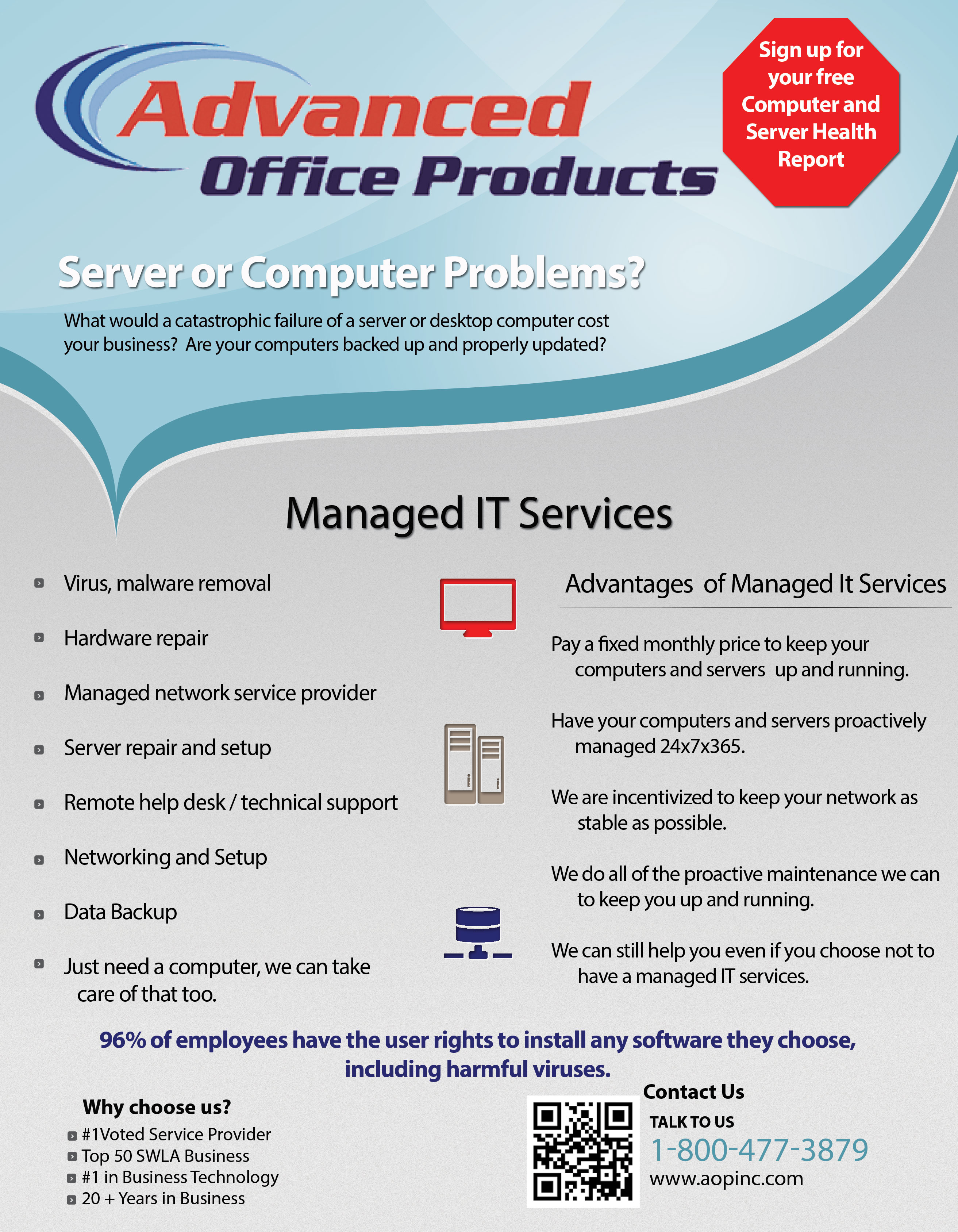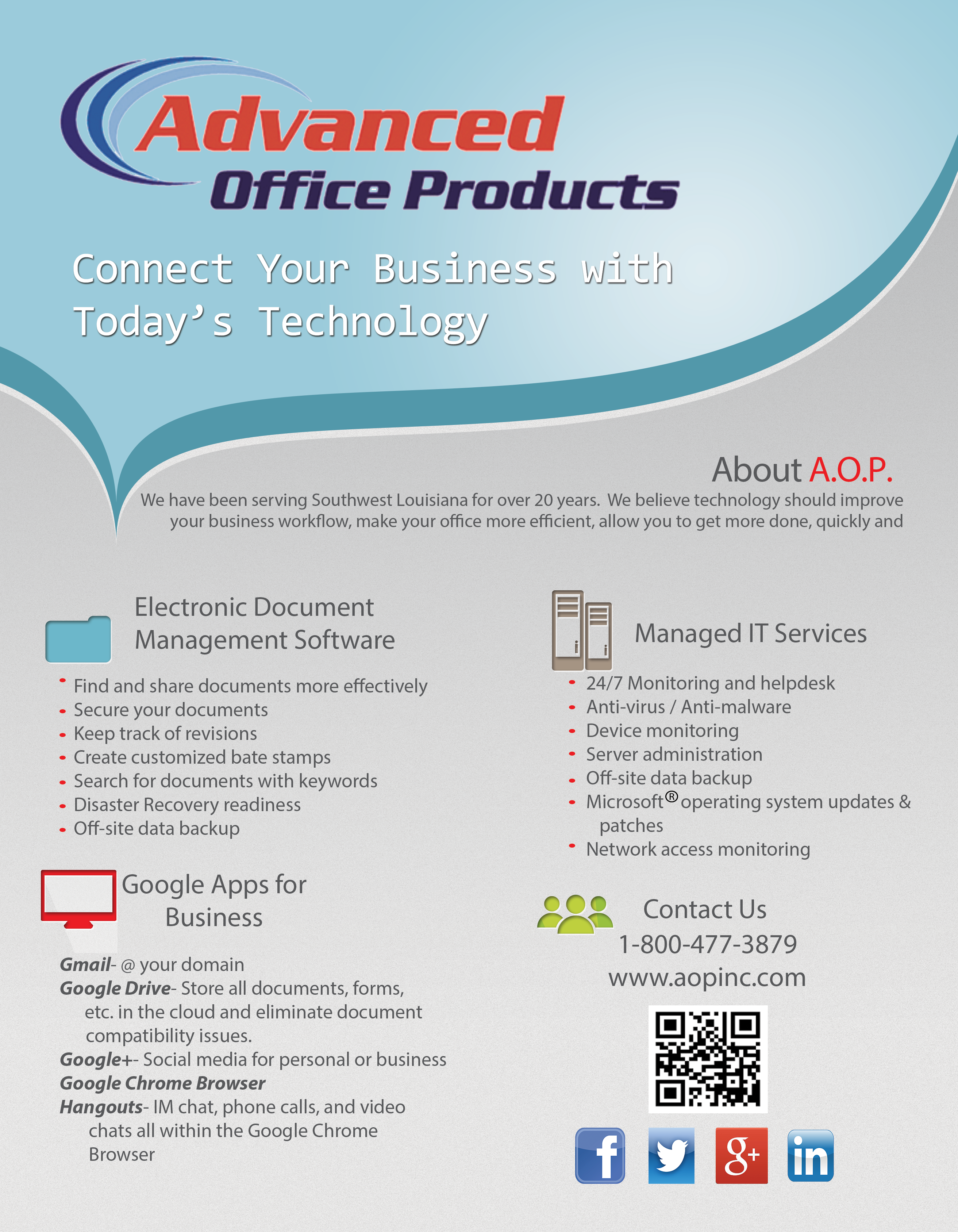 We are looking for a brochure and/or flyer to give to customers that grabs their attention. Our company is simple, we help companies become more efficient. We provide document equipment and document software such as copiers and printers, along with IT services such as managed IT. We have been voted #1 in service in our fields as well as top 50 company in SWLA (South West Louisiana). Email info@aopinc.com for any needed informations. Attached zip files has three PDFs with more information.