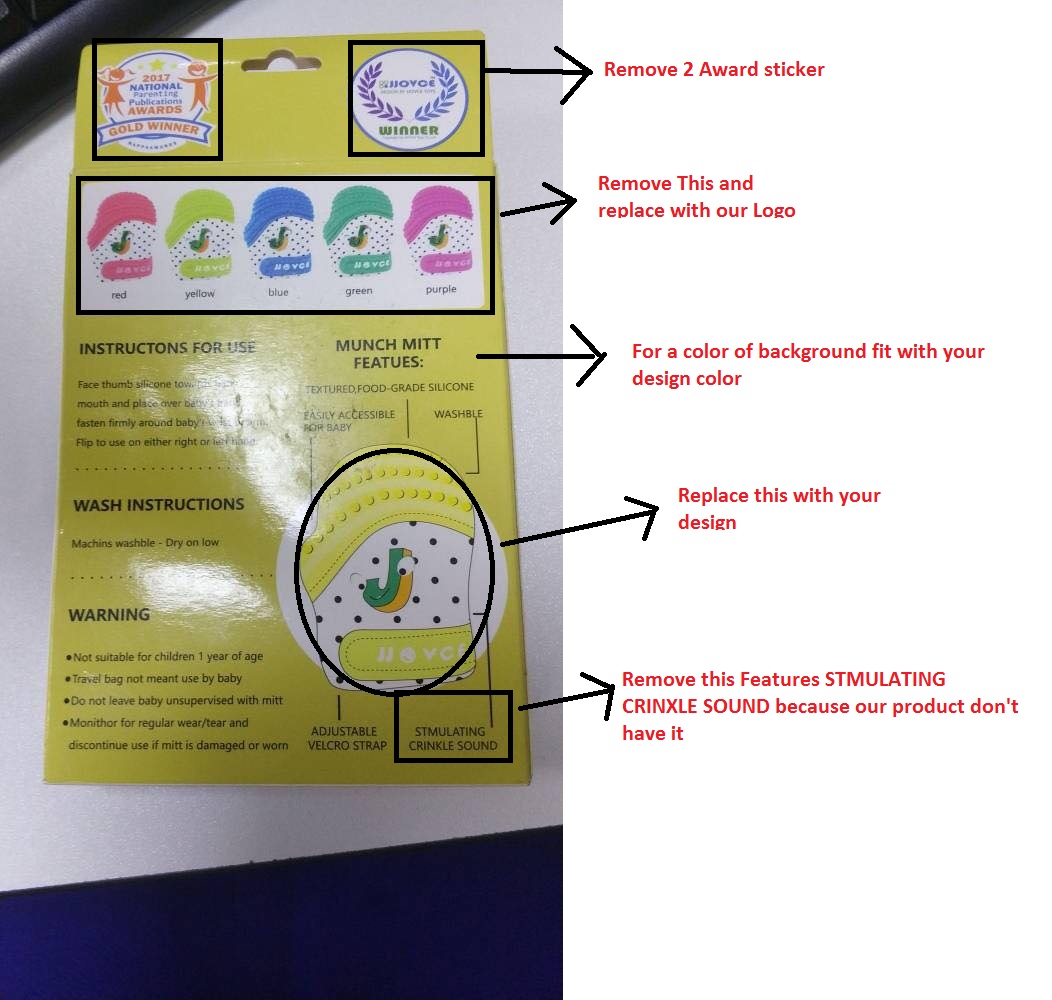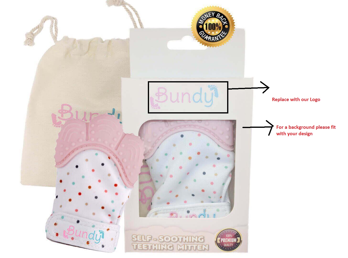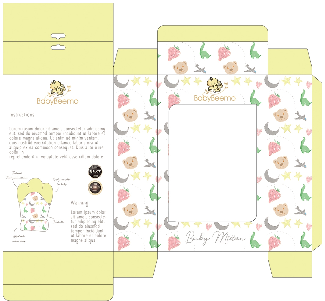 We need a box design for a new product Teething Mittens. Please check our file for a demo and Layout, Box mockup, Logo Vector