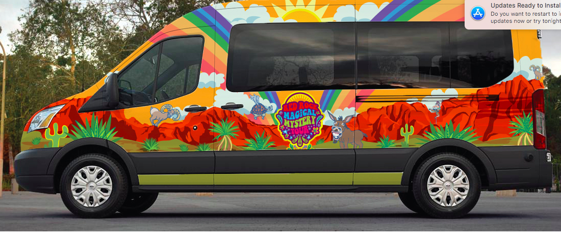 The tour is the Red Rock Magical Mystery Tours, so we want to play up a super colorful, catchy, eye popping graphic that will get everyone's attention immediately just by the logo and pic of our van on review websites like Trip Advisor, Expedia, Viator, etc.