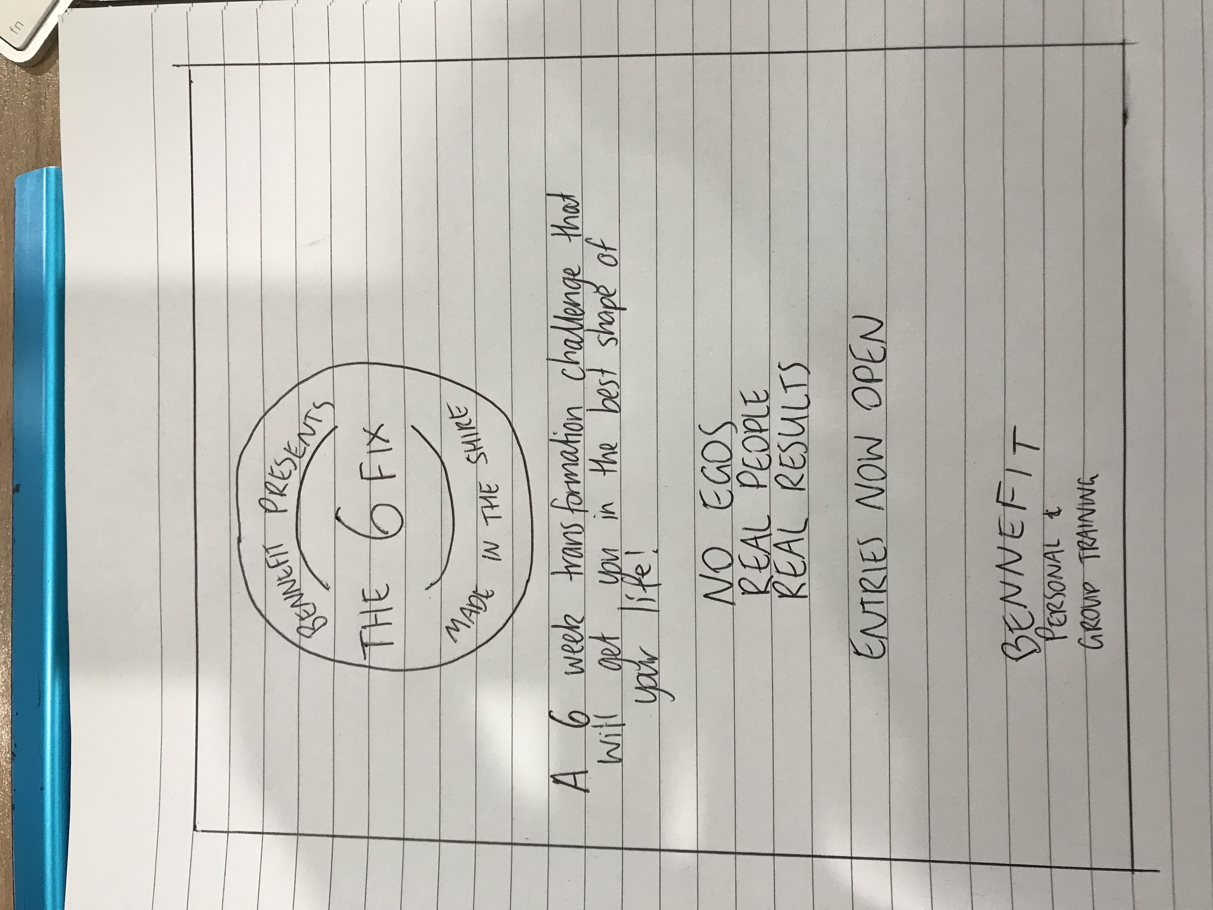 The design we would like has been sketched and added in files section, subject to minor word changes later on. Both logos have also been added to the file section as well. As per the sketch, At the top should be the 'Bennefit 6 FIX' logo. Underneath will have writing that says 'A 6 week transformation challenge that will get you in the best shape of your life!