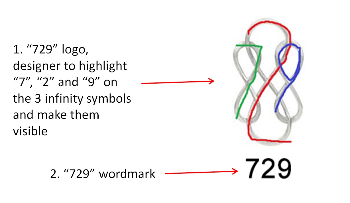 - -To include a triple infinity symbol as part of the logo design (with 729 highlighted on the motif, refer to "Triple Infinity,jpg" attachment