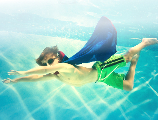 The characters should be aged about 8 or 9 years of age, wearing swimming togs, goggles and a superman cape.