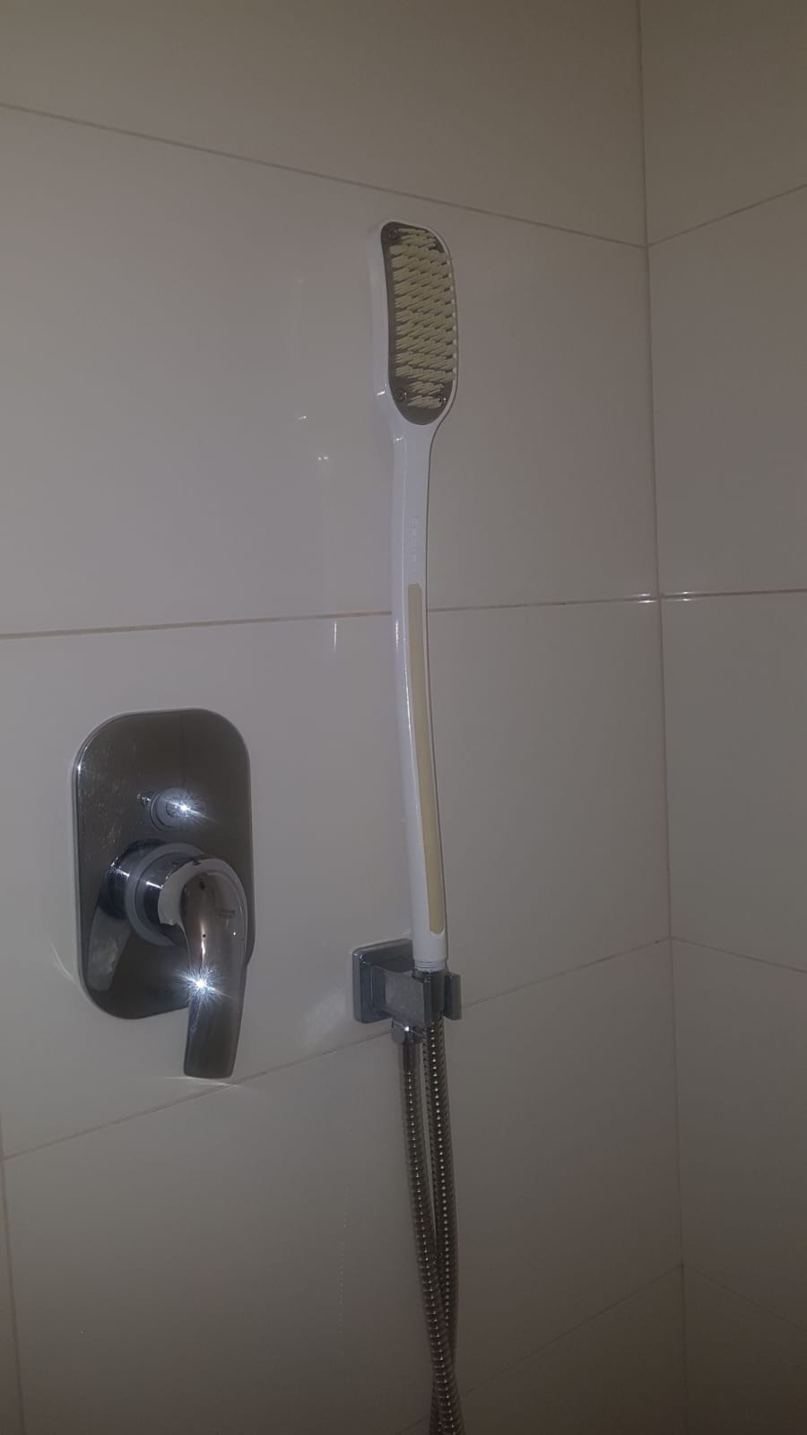 The product is a long shower head that replaces the old one, and can reach your back and scrub it while washing at the same time