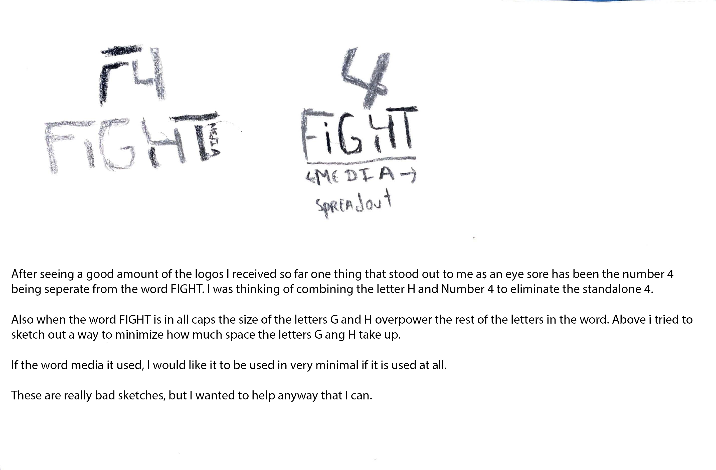 - After seeing a good amount of the logos I received so far one thing that stood out to me as an eye sore has been the number 4 being seperate from the word FIGHT. I was thinking of combining the letter H and Number 4 to eliminate the standalone 4.