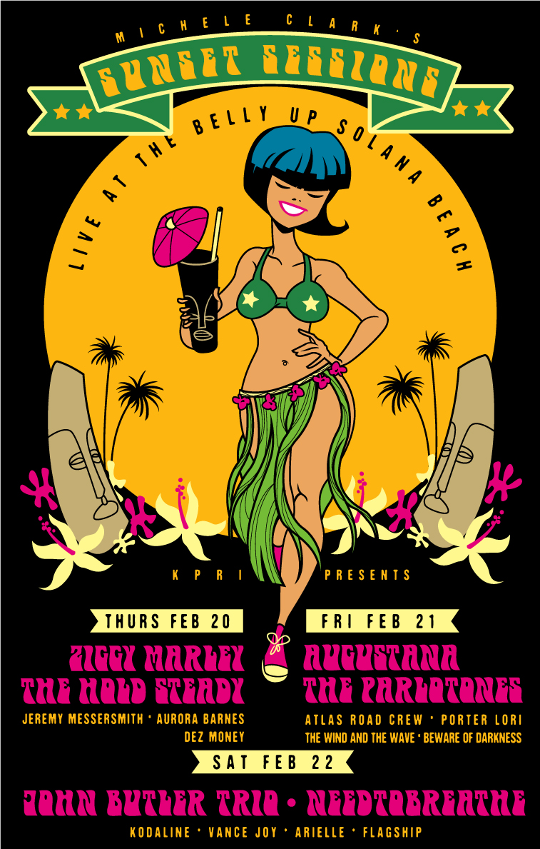 We need a poster design for our Sunset Sessions SXSW Showcase. It should include this info: "Michele Clark Presents Sunset Sessions Alumni SXSW Showcase- Featuring Melissa Etheridge, Bob Schneider, Alpha Rev, The Parlotones, and Louise Goffin. March 13th, 2014, The Paramount Theatre". To get a feel of how we would like this to look, please see our website (www.sunsetsessions.org), and please find our logo, and example posters attached. We would like to go for the old-hawaiian feel with this, and incorporate the SXSW Austin vibe as well!