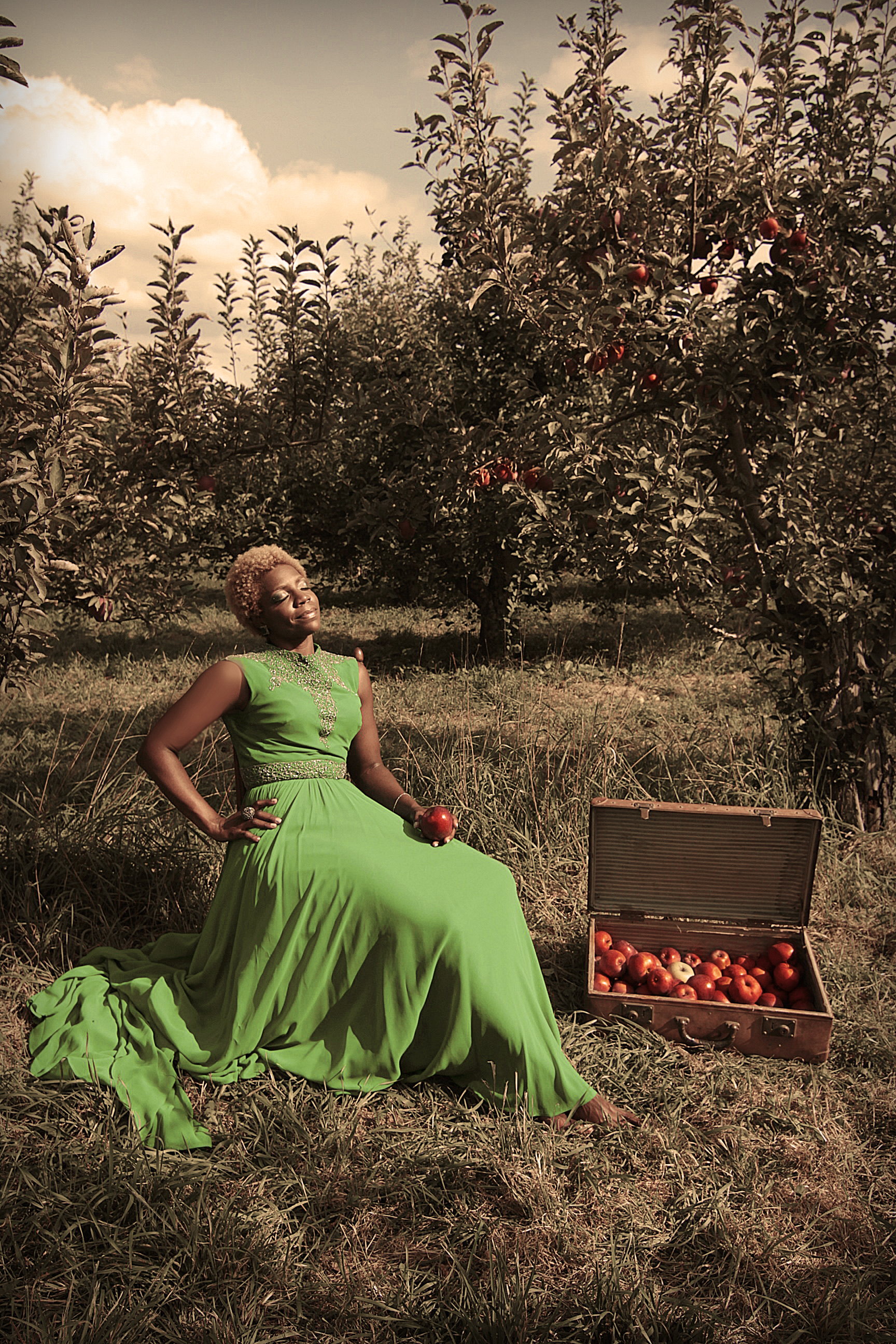 I would like to continue the theme on the first page in the green dress and orchard.