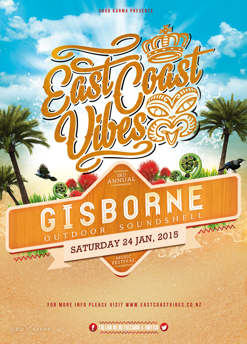 East Coast Vibes needs a new tee shirt design. Our festival is based in Gisborne - New Zealand, at one of the best surf breaks in the region. The vibe is laid back, with a music program of soul/ roots/ hiphop/ Pacific reggae.