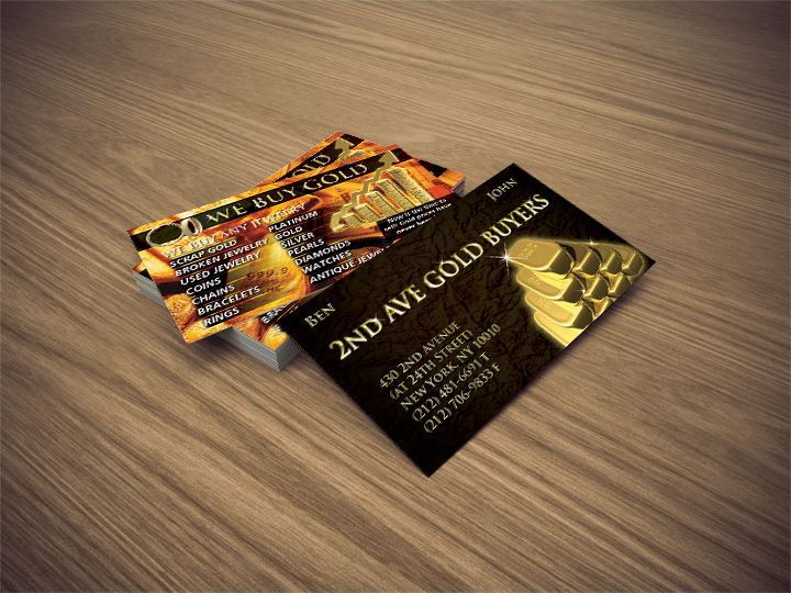 - I would like this to have pictures of gold and silver. Maybe some jewelry in a pile. We are a company that buys scrap gold and jewelry. I would like to see some boldness, this card is a marketing tool and it should leave an impression.