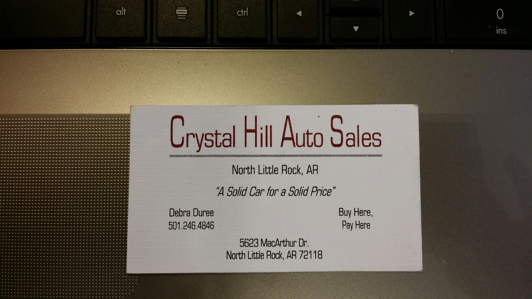 Crystal Hill Auto Sales is a woman owned women friendly car lot. We focus on providing Professionalism, Integrity and Respect beginning with the initial introduction. We place the highest importance on customer service after the sale and our rating with the BBB of Arkansas shows it. We're starting out 7th year, recently relocated. Satisfied Clients bring their family members, friends and co-workers to buy their cars, SUV's and trucks from CHAS.