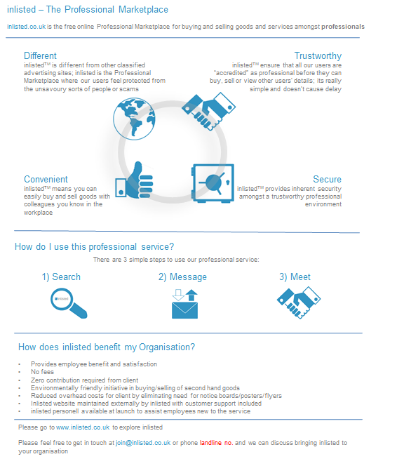 inlisted.co.uk that we are about to launch is the free online Professional Marketplace for buying and selling goods and services amongst professionals.
